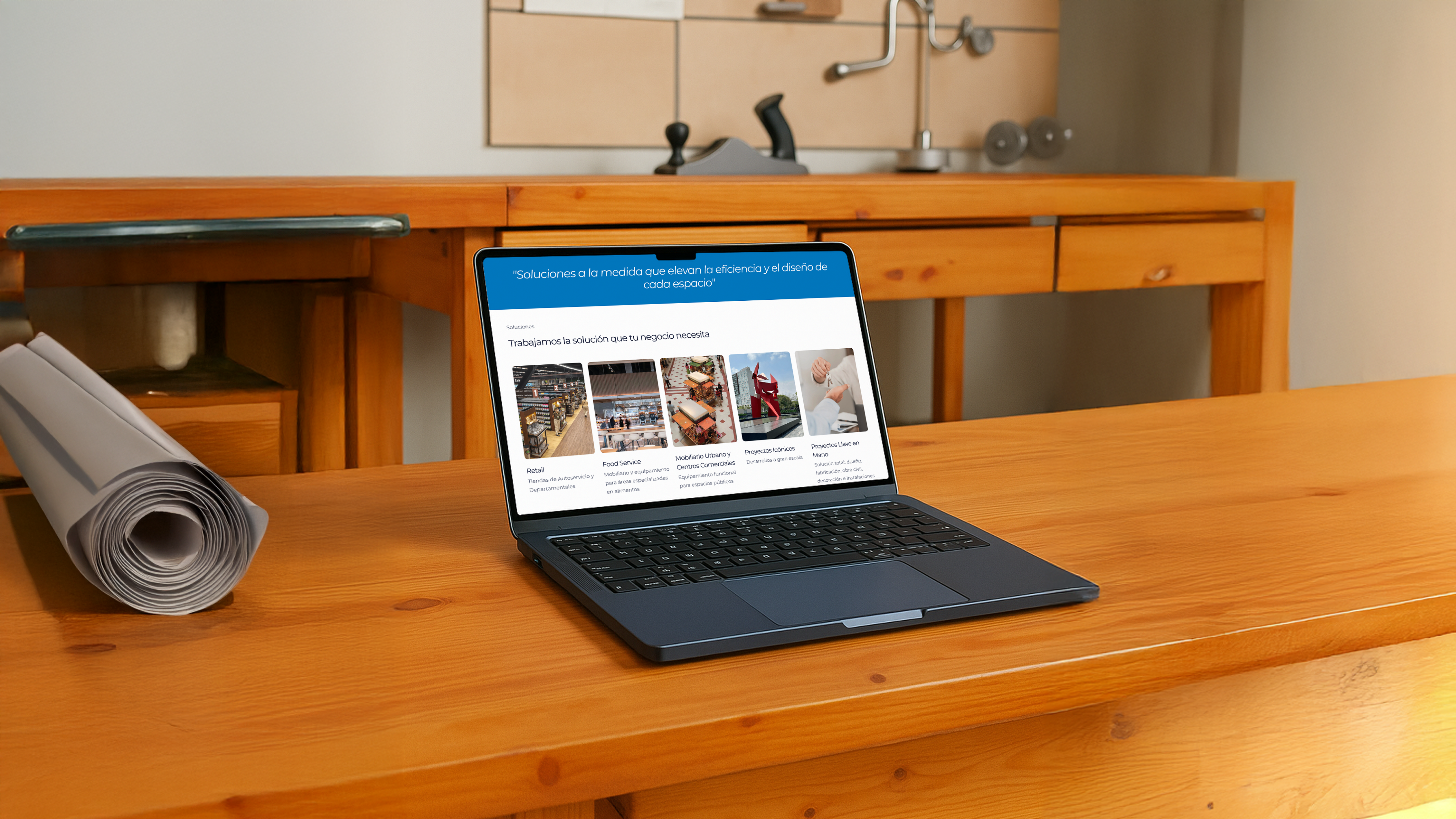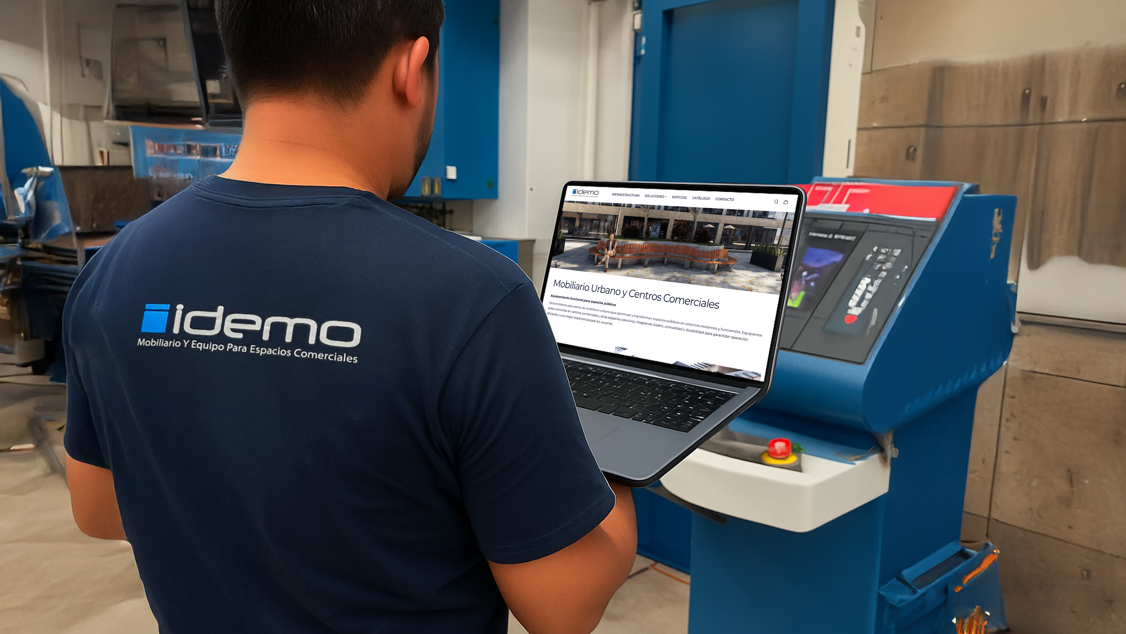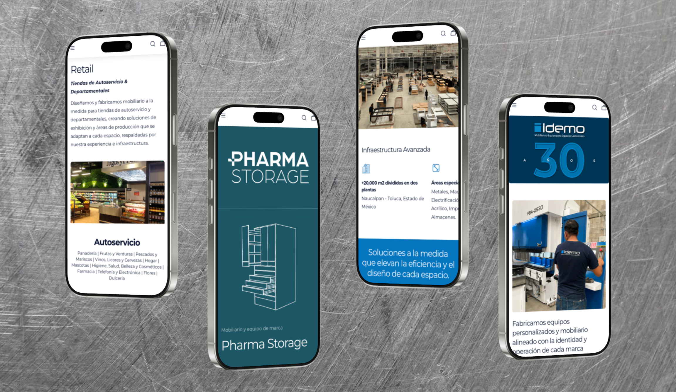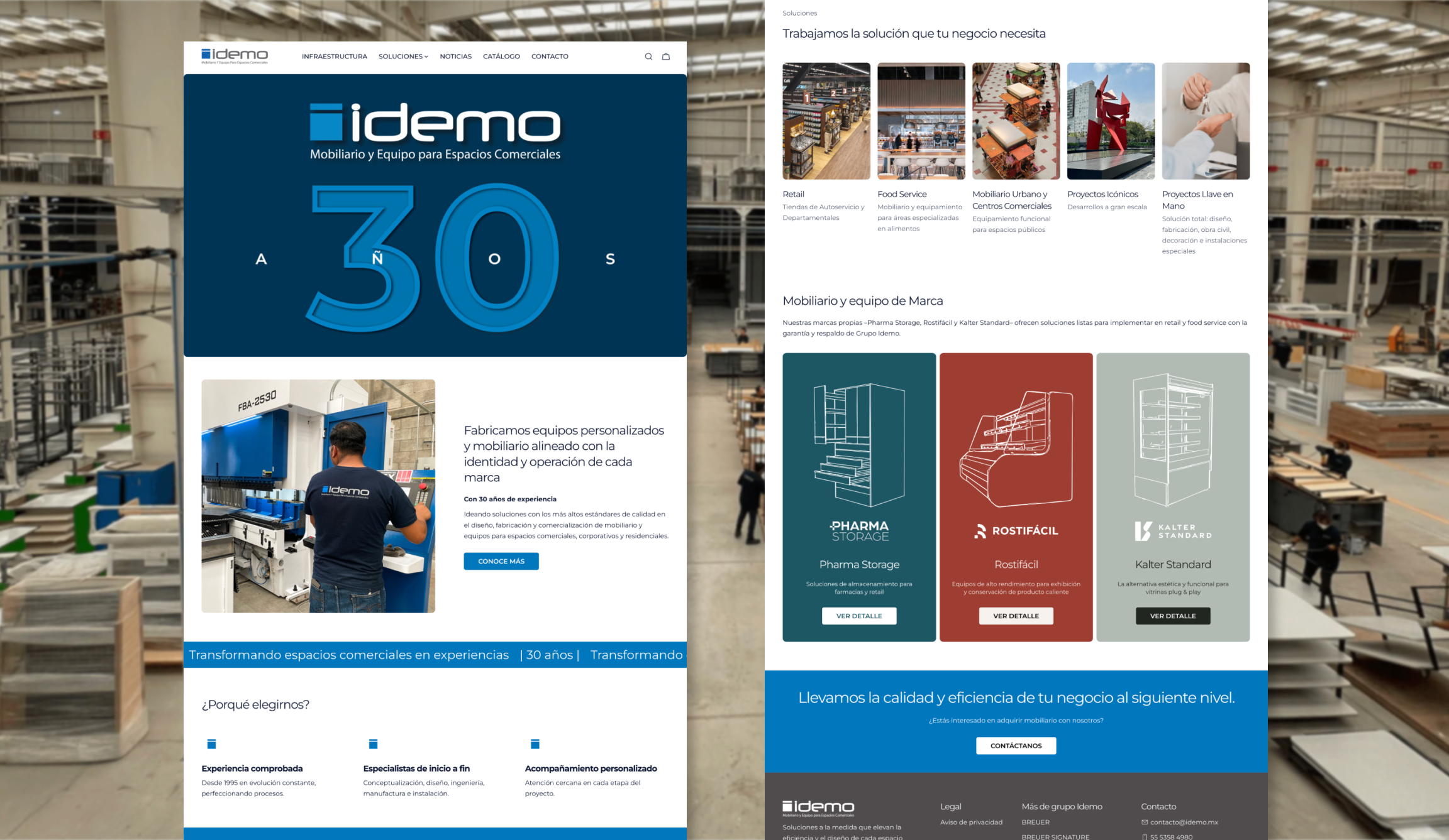 Grupo Idemo, fabricantes de equipos personalizados y mobiliario para marcas, necesitaba un sitio que comunicara con claridad su propuesta de valor: infraestructura sólida, soluciones a la medida y más de 30 años de experiencia en el sector.